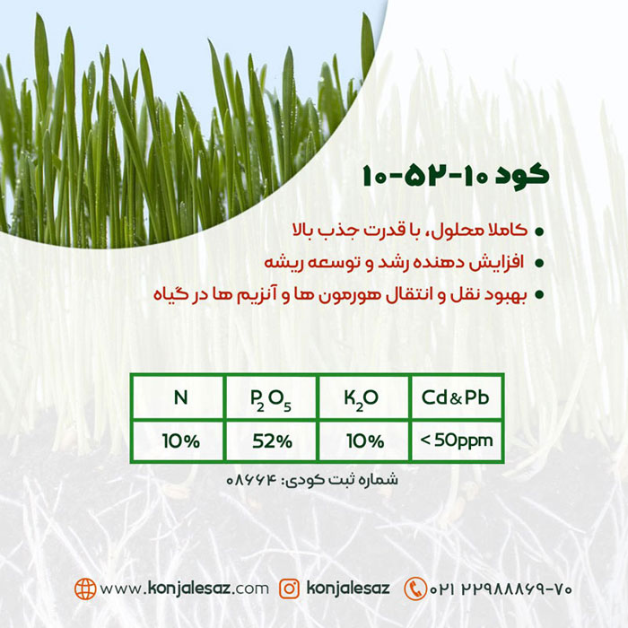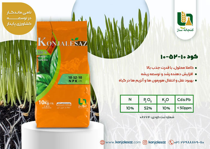 کود کامل NPK 10-52-10 فسفر بالا، به عنوان یک محرک رشد سریع عمل کرده، و به دلیل داشتن مقادیر بالای فسفر برای استفاده در زمان ریشه زایی و توسعه ریشه بسیار مناسب است. چرا که تولید ریشههای ثانویه و ریشههای مویی سبب افزایش سطح تماس بیشتر ریشه با خاک شده و به گیاه فرصت میدهد تا بتواند مواد غذایی و رطوبت را از محدوده بیش تری از خاک تامین کند. کمبود فسفر در گیاهان به صورت اختلال درمرحله زایشی،تاخير و بینظمي درگلدهي و رسيدگي دانه در آنها ديده ميشود.