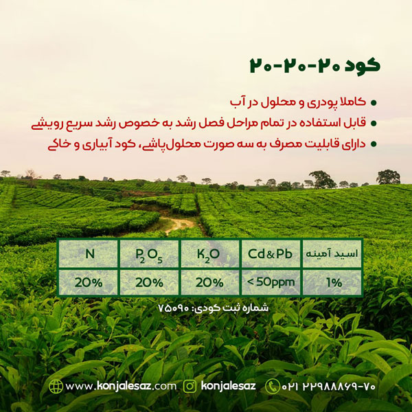 کود سه بیست ( NPK 20 20 20 ) حاوی عناصر نیتروژن، فسفر و پتاسیم به نسبت متعادل و دارای عناصر ریزمغذی است. درpH خاکهای قلیایی که برای کلیه محصولات زراعی و باغی در طی زمان رشد قابل استفاده میباشد و مصرف آن در کلیه سیستم های آبیاری امکان پذیر می باشد. این محصول علاوه بر اینکه باعث رشد گیاه و افزایش حاصلخیزی خاک میشود، تنظیم کننده فتوسنتز و ضخیم کننده دیواره سلولی و افزایش دهنده مقاومت ساقه ها می باشد.