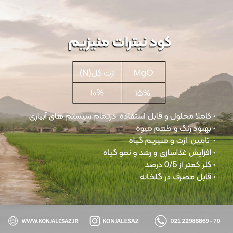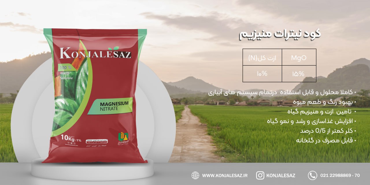 نیترات منیزیم (Magnesium nitrate) با فرمول Mg(NO3)2، یک منبع منیزیم کریستالی بسیار محلول در آب است. نیترات موجود در این کود جذب منیزیم را توسط گیاه تسهیل می کند و در نتیجه کارایی آن را بهبود می بخشد. همچنین نیاز گیاه به نیتروژن را نیز برطرف میکند. منیزیم یک ماده مغذی حیاتی برای رشد سالم گیاه است چرا که یک عنصر کلیدی از مولکول کلروفیل است، بنابراین برای فتوسنتز و تشکیل کربوهیدرات ها ضروری است. کمبود منیزیم با نوارهای زرد رنگ بین رگبرگها آشکار می شود. علائم ابتدا روی برگ های مسن نشان داده می شود و با تشدید کمبود به سمت برگ های جوان حرکت می کند. در موارد شدید، نکروز ممکن است ظاهر شود.